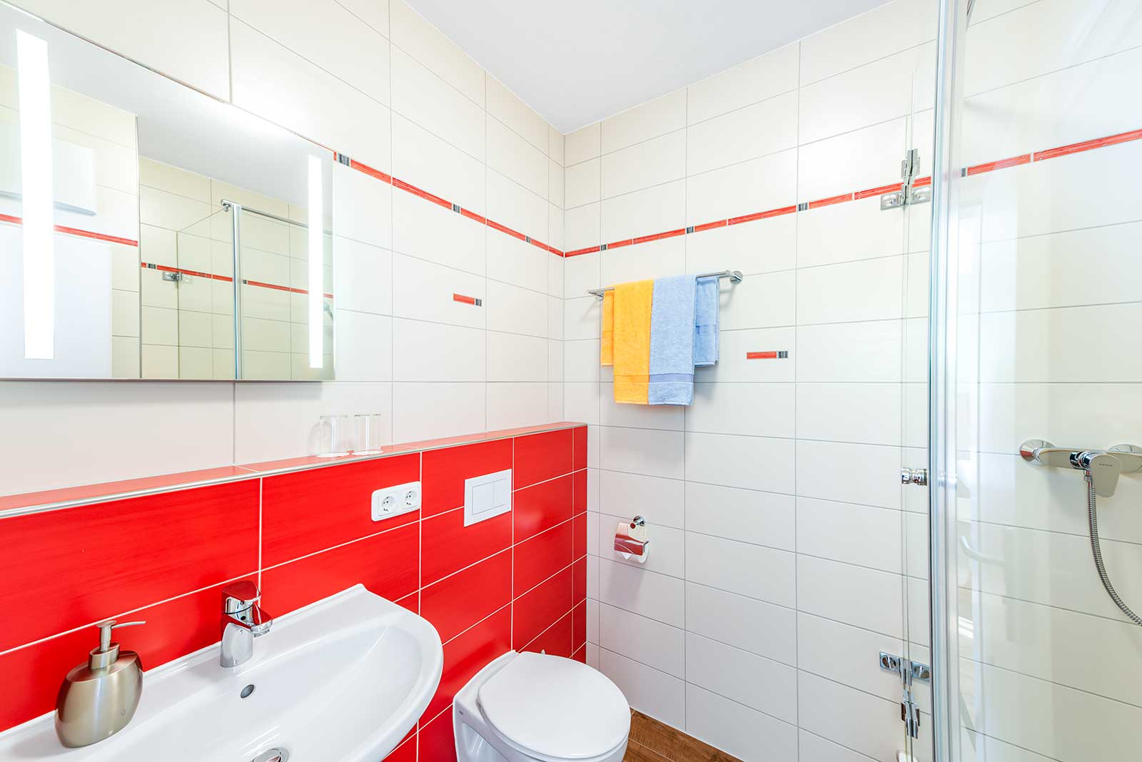 Das Bad ist mit Dusche und WC ausgestattet. Ein 32” Smart-TV, ein praktischer Schreibtisch und ein geräumiger Schrank sorgen für zusätzlichen Komfort. In einigen Zimmern lädt eine gemütliche Couch zum Entspannen ein.