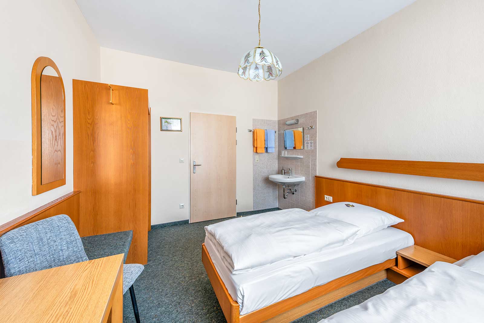 Unser Economy Zimmer bietet auf ca. 15-25 m² eine praktische und gemütliche Unterkunft für preisbewusste Reisende. Die Zimmer sind mit einer eigenen Waschgelegenheit ausgestattet, während die Gemeinschaftsbäder stets sauber und gepflegt zur Verfügung stehen.