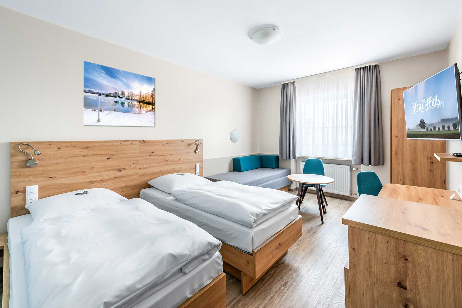 Das Zimmer kann auf Wunsch auch als Zweibett- oder Dreibettzimmer genutzt werden. Ideal für Geschäftsreisende und Urlauber, die Komfort und Funktionalität schätzen.