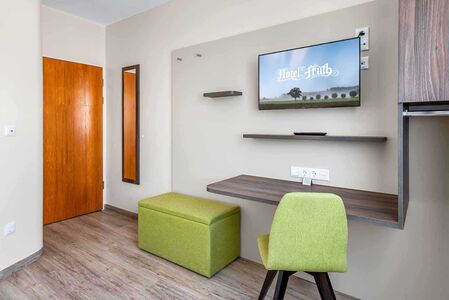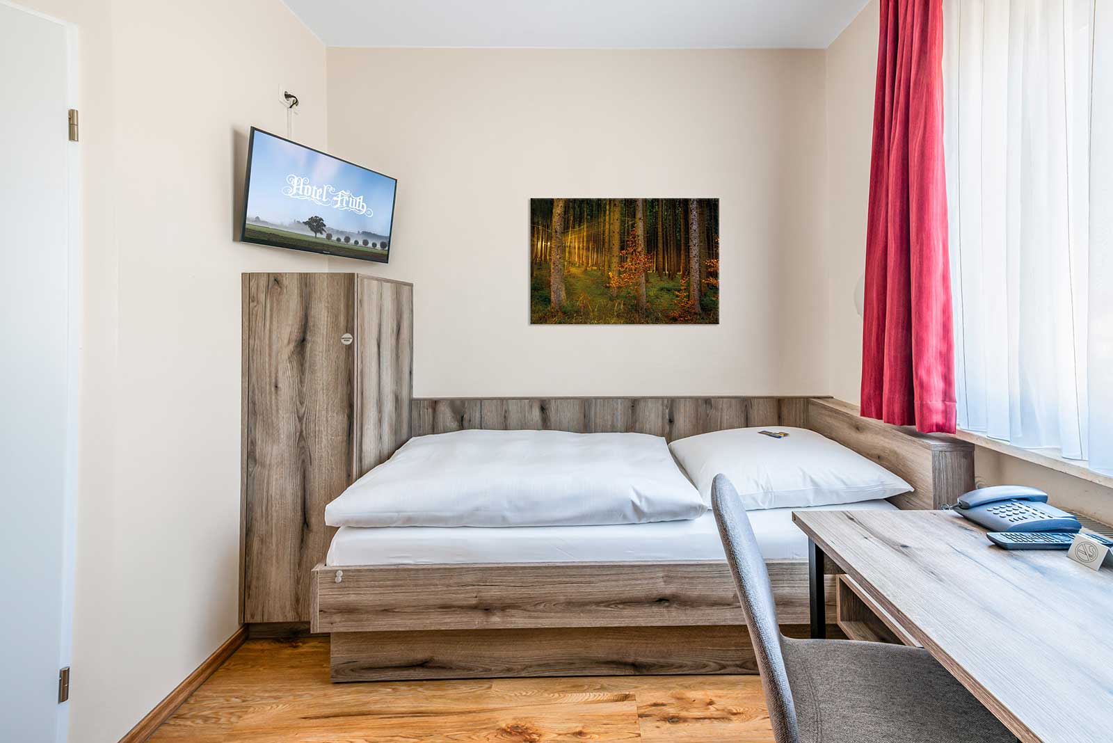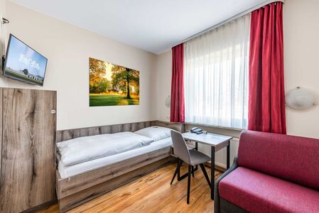 Unser Komfort Einzelzimmer bietet auf ca. 15 m² alles, was Sie für einen angenehmen Aufenthalt benötigen. Das bequeme Einzelbett (0,90 m x 2,00 m) mit hochwertiger Matratze sorgt für erholsamen Schlaf.