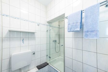 Das moderne Bad verfügt über eine Dusche und ein WC. Zur Ausstattung gehören ein 32” SMART-TV, ein praktischer Schreibtisch, ein geräumiger Schrank und ein Zimmersafe.